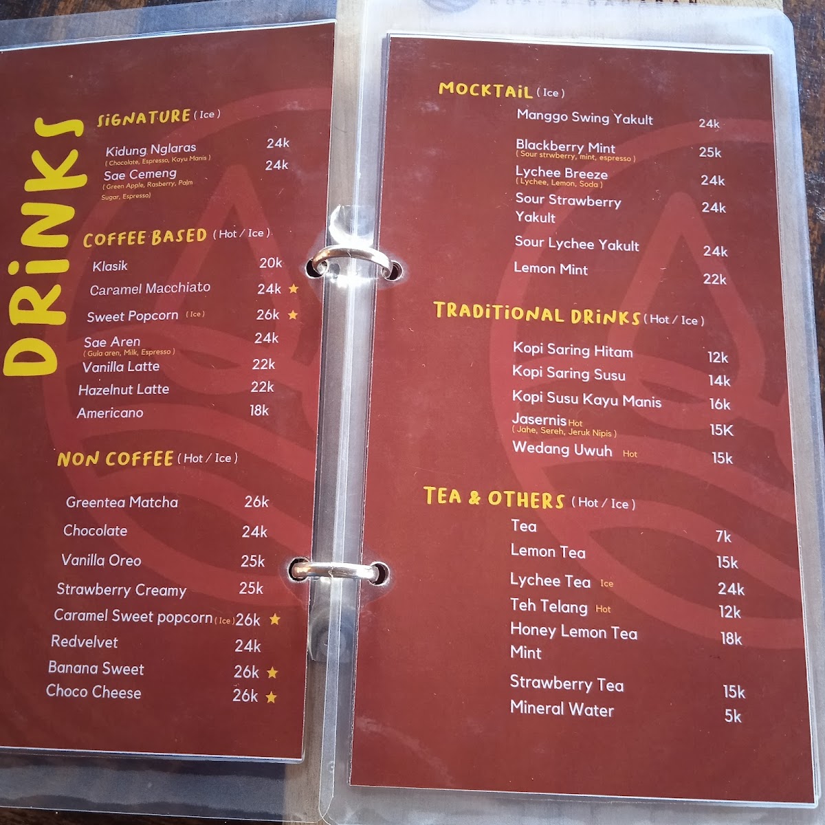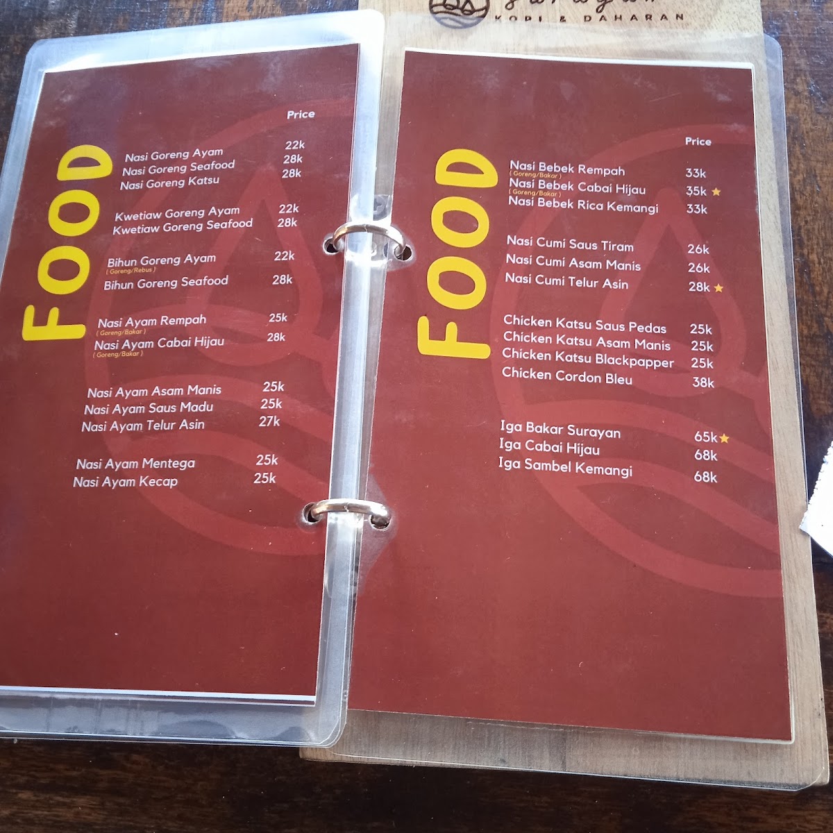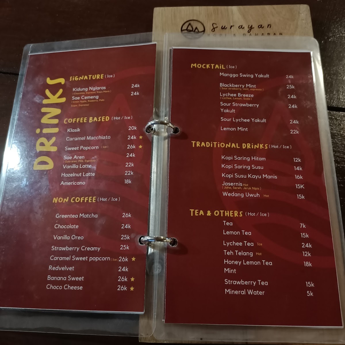 Joglo Surayan's menu offers a delightful blend of traditional Indonesian flavors with a touch of modern flair, making it a great destination for both locals and visitors. Among the standout dishes, Cappuccino is a perfect choice for those who appreciate a rich, aromatic coffee, beautifully presented to complement the cozy ambiance. For those seeking something heartier, the Kwetiaw Goreng stands out as a savory favorite, offering a satisfying balance of flavors with stir-fried rice noodles, vegetables, and meat. The restaurant's menu caters to a variety of tastes, featuring a range of both light and hearty options, all prepared with fresh, high-quality ingredients. Whether you're in the mood for a comforting coffee or a flavorful stir-fry, Joglo Surayan provides a dining experience that blends the best of Indonesian cuisine with a welcoming atmosphere.